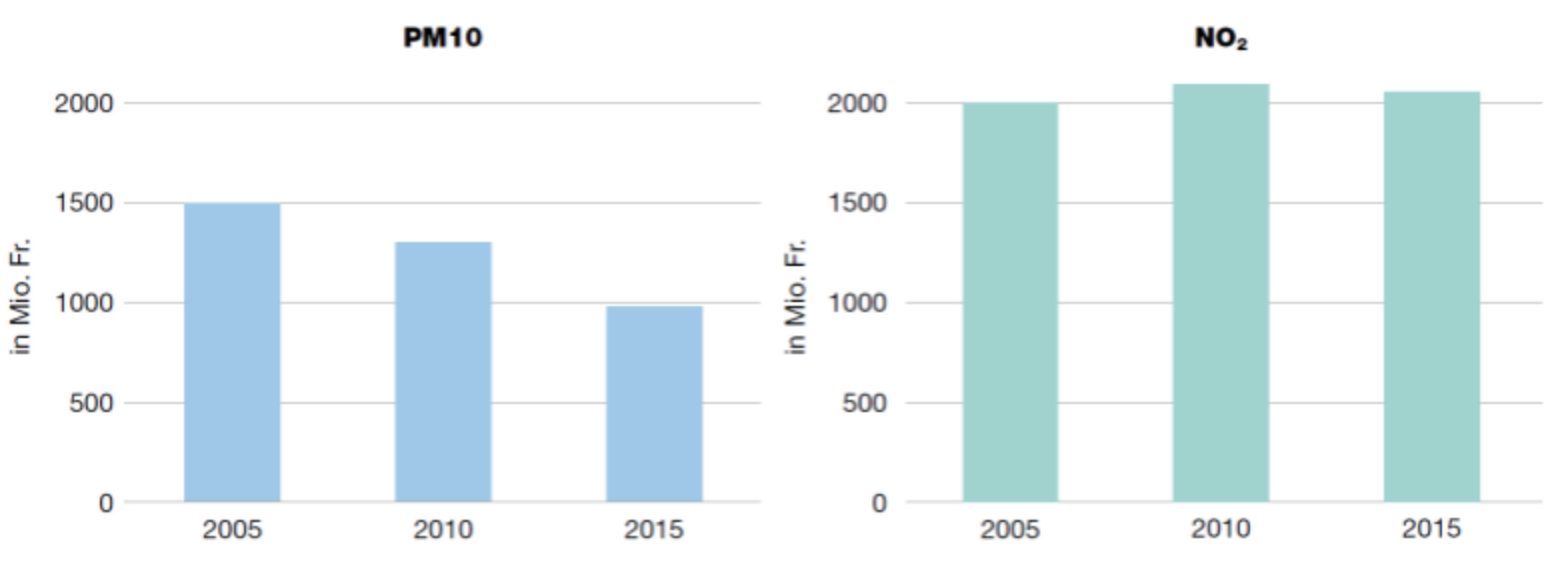 Die volkswirtschaftlichen Gesundheitskosten durch Luftschadstoffe haben im Kanton Zürich in den letzten zehn Jahren abgenommen. Diejenigen durch Feinstaub PM10 auf ca. 1 MCHF, Stickstoffdioxid NO2 stagnieren auf hohem Niveau von 2 MCHF. Weitere Massnahmen speziell beim Verkehr werden gefordert. Quelle: AWEL